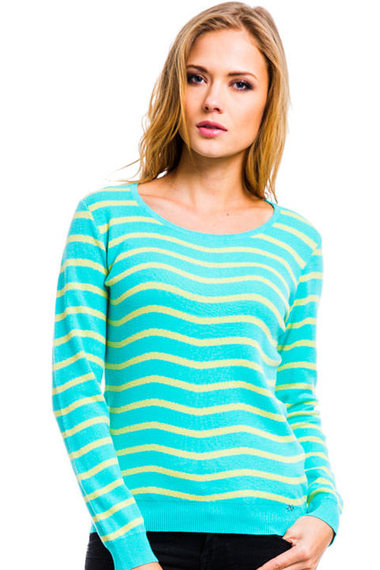 Яркий джемпер бирюзового цвета в полоску непременно поднимет Вам настроение! А тонкая трикотажная фактура подарит уют и тепло!