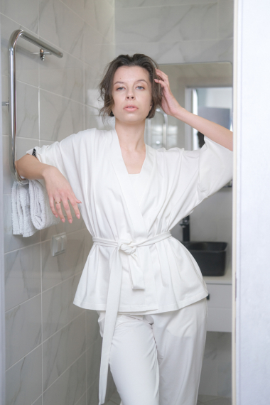 Хлопковый трикотаж премиум-класса, не скатывается и не садится при стирке. В серии Home идеально сочетаются топ, кимоно и брюки. Вы можете выбрать все позиции в одном оттенке или поиграть с сочетанием различных цветов.